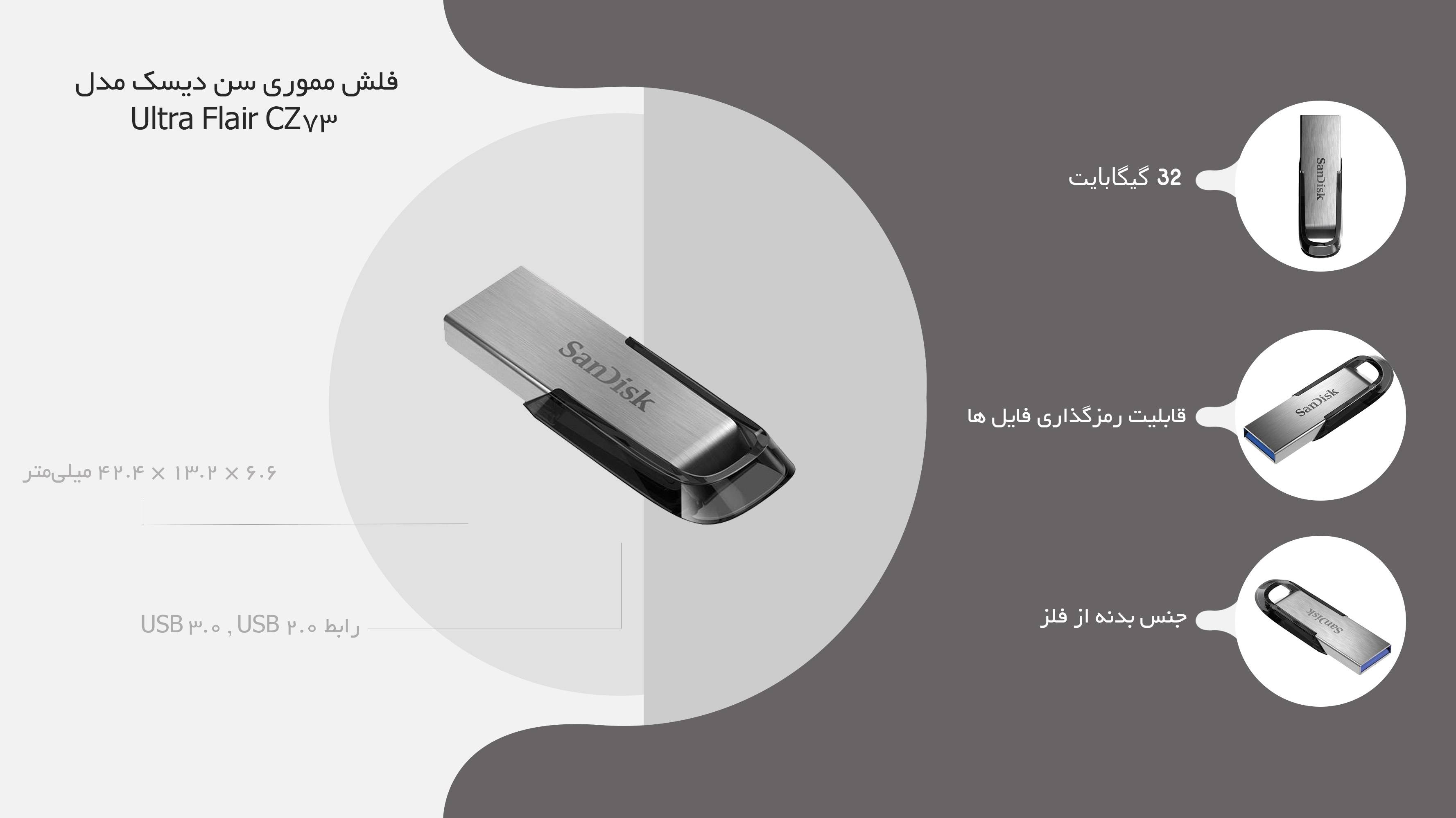 «CZ73 Ultra Flair» یک فلشمموری ساده و کوچک با ظاهری شیک و زیباست که شرکت «سندیسک» آن را طراحی و تولید کرده است. سندیسک یک شرکت فعال در حوزهی تولید انواع فلشمموری و مموریکارت است که در سال 1988 در آمریکا بنا نهاده شد و از سال 2015 بهعنوان زیرمجموعهای از شرکت وسترن دیجیتال (Western Digital) فعالیت میکند. Cruzer CZ73 Ultra Flair دارای بدنهای فلزی و شکیل است که در همان نگاه اول شما را مجذوب خود میکند. فلشمموری SanDisk Cruzer CZ73 Ultra Flair از پورت USB 3.0 بهره میبرد؛ بنابراین یک فلشمموری بسیار سریع و مطمئن برای جابهجایی و ذخیرهسازی فایلهای مهم شماست که با پورت USB 2.0 هم سازگاری کامل دارد. این محصول در ظرفیتهای 16, 32, 64 و 128 گیگابایتی ساخته شده است.
